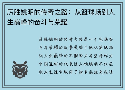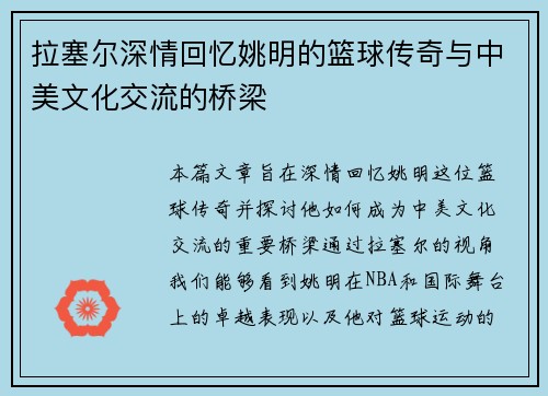 本篇文章旨在深情回忆姚明这位篮球传奇,并探讨他如何成为中美文化交流的重要桥梁。通过拉塞尔的视角,我们能够看到姚明在NBA和国际舞台上的卓越表现,以及他对篮球运动的影响。姚明不仅仅是一位伟大的球员,他更是连接两种文化的纽带,促进了中国与美国之间的互动与理解。本篇文章将从四个方面展开讨论:姚明的篮球成就...